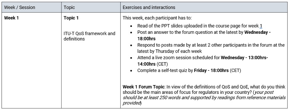 The ITU Academy recommends an experiential learning approach, making use of case studies, problem-based learning activities, (self-) reflection, demonstrations, gamification, simulation (where applicable). Please consult the ITU Academy quality assurance checklist (Step 2) for reference.