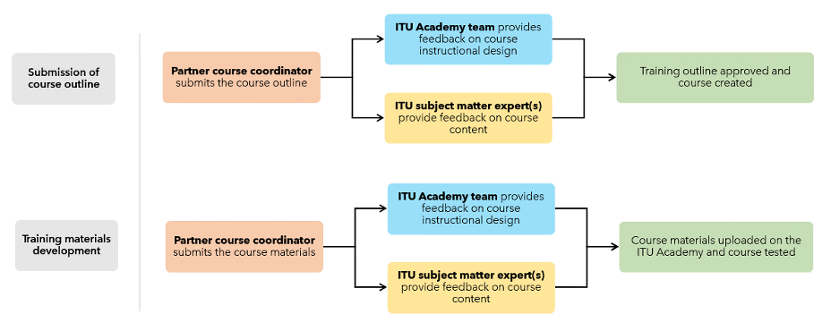 The process below contains both an instructional design perspective, handled by the ITU Academy, as well as a content perspective, handled by ITU subject-matter expert teams.