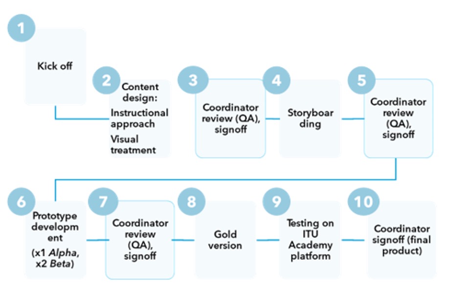 | DEPLOYMENT | 9. Testing on the ITU Academy platform | Technical quality assurance stage to confirm that the course functions properly on the ITU learning platform (launch, completion, tracking). | Course added to catalogue | |