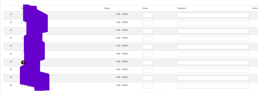 - Attendance: if not online or not through the Zoom integration with Moodle. Go to the grades, locate the grade item participation (previously added through the gradebook set up) and click on the edit icon, enter grades for each participant and click “Save”.