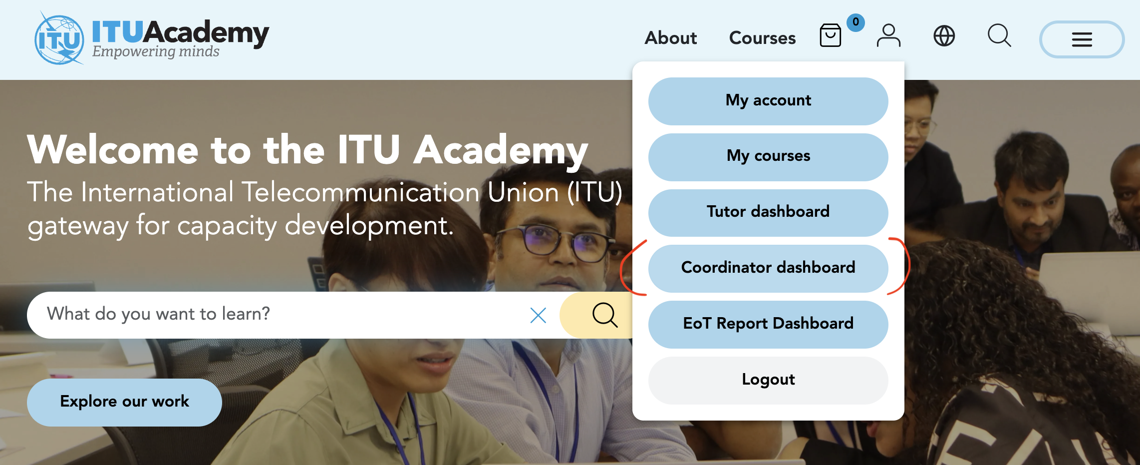 The list of applicants for a course is available under the “Coordinator” menu tab on the ITU Academy.