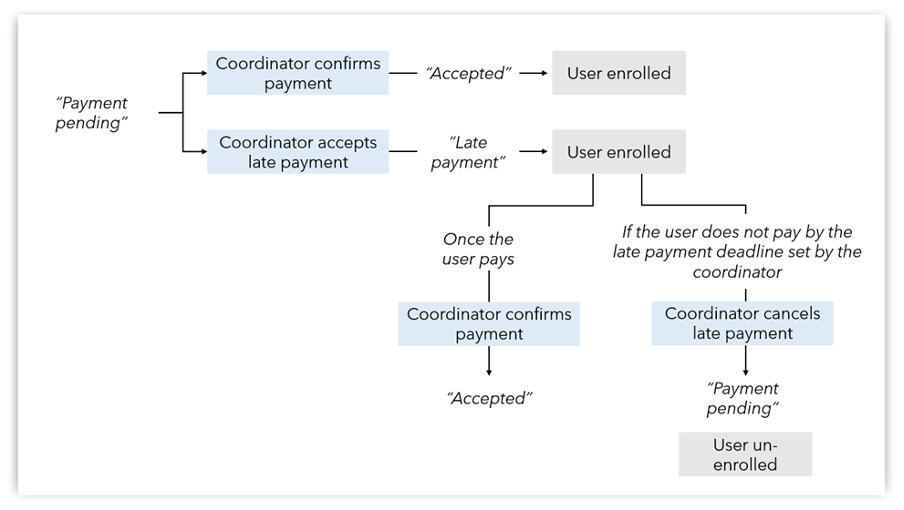 - If a participant has not yet completed payment but has informed that they need more time, you can select their name and lick “Allow late payment”. This will give the user access to the course while still allowing you to track remaining payments. If the user confirms their payment, you can click on “Accepted” to finalize their status. If the user fails to pay by the set deadline, you can click on “Cancel late payment”, changing their status back to “Payment pending” and removing their access to the course.