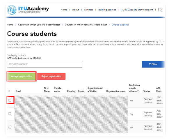 In exceptional cases, where participants are specifically selected or invited for a course, the coordinator can gather their contact details and the ITU Academy team can manually upload them.